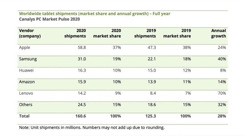 Over the course of the complete year, Samsung shipped 31 million tablets in 2020. The company’s market share was 19%, a healthy 40% improvement compared to 2019. Apple shipped 58.8 million iPads last year, grabbing a market share of 37%. Huawei, Amazon, and Lenovo’s shipments stood at 16.3 million, 15.9 million, and 14.2 million, respectively, during 2020. From the looks of it, all brands selling tablets benefitted from the pandemic due to the unusually high demand for devices that help in remote learning.