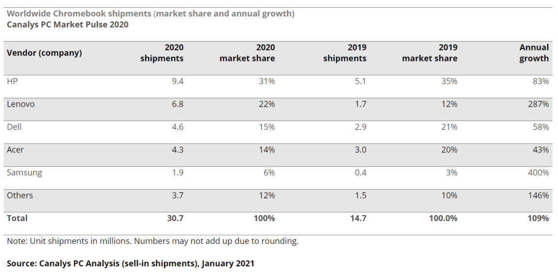 Although the South Korean firm had the highest growth in the global Chromebook market, it still has a lot of room to grow. HP was the biggest Chromebook brand in 2020 with 9.4 million shipments and a 31% market share. Lenovo shipped 6.8 million Chromebooks and acquired a 22% share of the market. Dell (15% market share) and Acer (14% market share) were ranked third and fourth, respectively, with shipments of 4.6 million and 4.3 million.